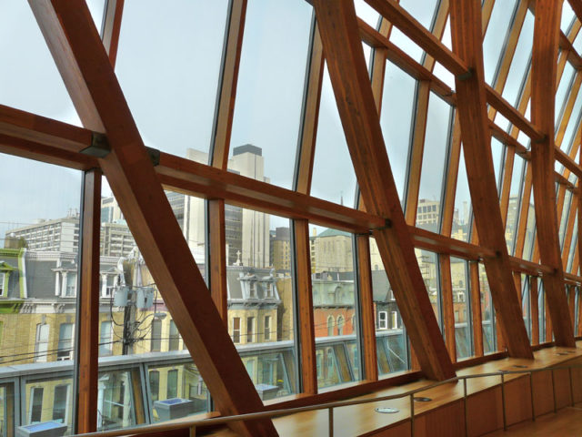 Como teve que trabalhar com um edifício já existente, Gehry realizou em Toronto um projeto bem mais modesto que o celebrado museu de Bilbao. As linhas curvas da nova fachada norte não chegam a ser impressionantes, talvez porque a AGO fica numa rua apertada e movimentada, e não há como apreciar o desenho do arquiteto com a distância necessária. O que pouca gente faz é dar a volta no prédio onde está a grande surpresa.